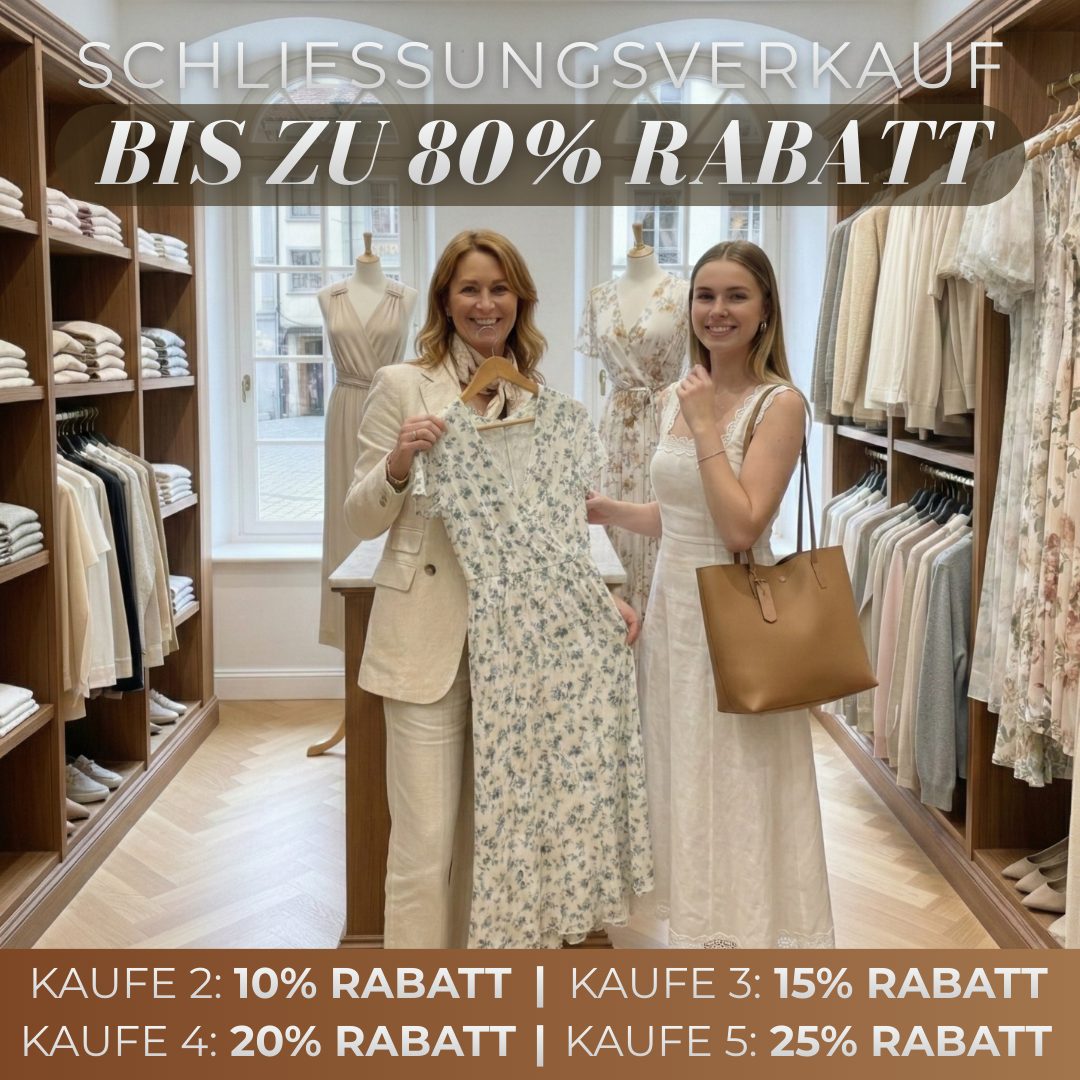 Mit schwerem Herzen schließe ich mein Geschäft, das mit der Unterstützung meines Mannes aufgebaut wurde. Doch aufgrund persönlicher Umstände müssen wir uns nun um das Familienunternehmen kümmern. Um den restlichen Bestand zu räumen, veranstalte ich einen großen Ausverkauf mit Rabatten von bis zu 85%. Verpassen Sie es nicht – wenn sie weg sind, sind sie weg!